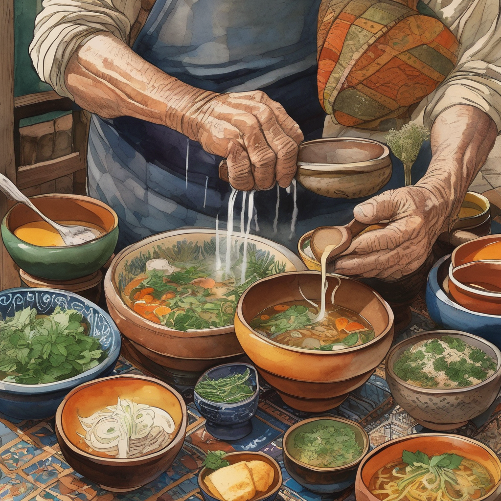 Ultra Realistic Photo Of A Grandmother Pouring Soup Into Bowls