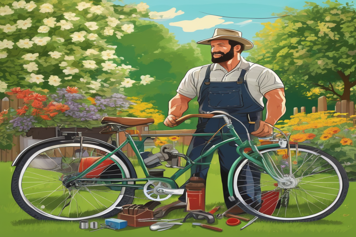 Ultra Realistic Photo Of A Man Fixing A Bicycle In A Backyard