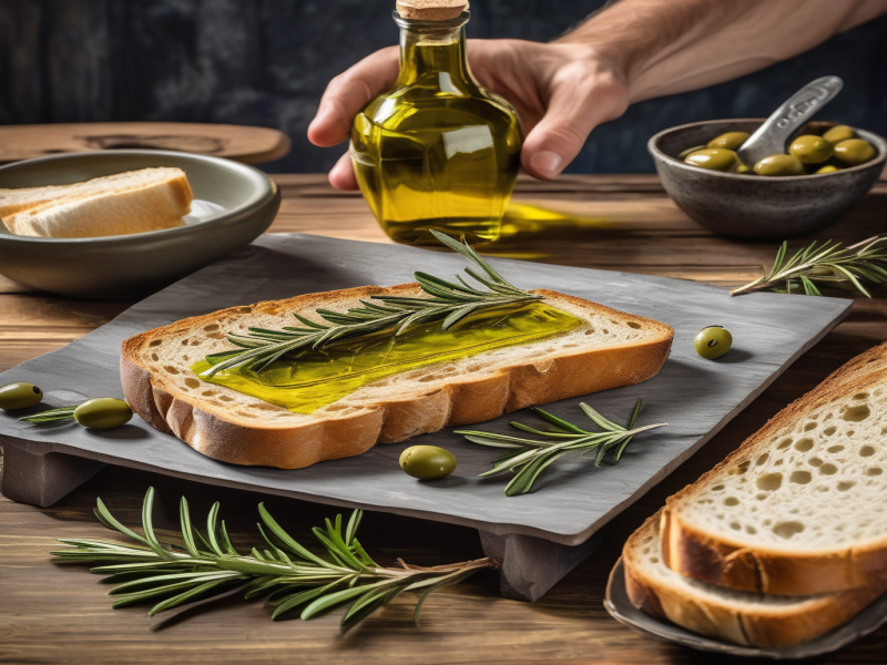 Ultra Realistic Photo Of A Man Pouring Olive Oil On Fresh Bread