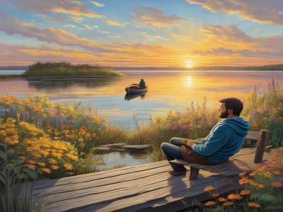 Ultra Realistic Photo Of A Man Sitting At The Edge Of A Dock At Sunris