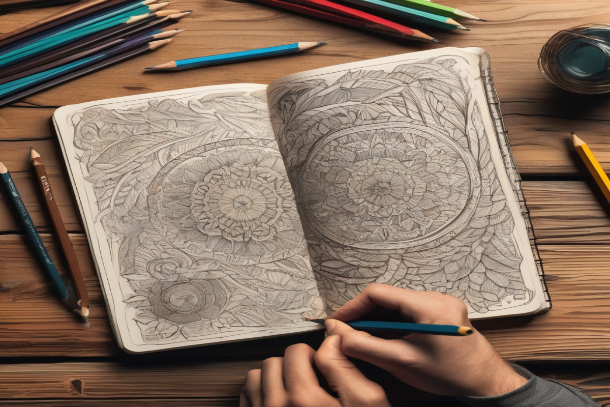 A Hand Sketching In A Notebook With Pencils Scattered Around Wood Grai