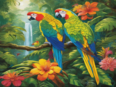 Two Parrots Sitting On A Branch In A Tropical Jungle Vivid Colors